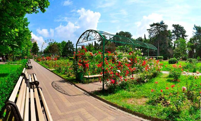 В розарии представлено большое разнообразие сортов роз, адаптированных к климату Сочи.